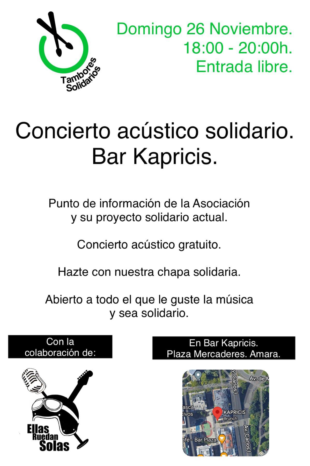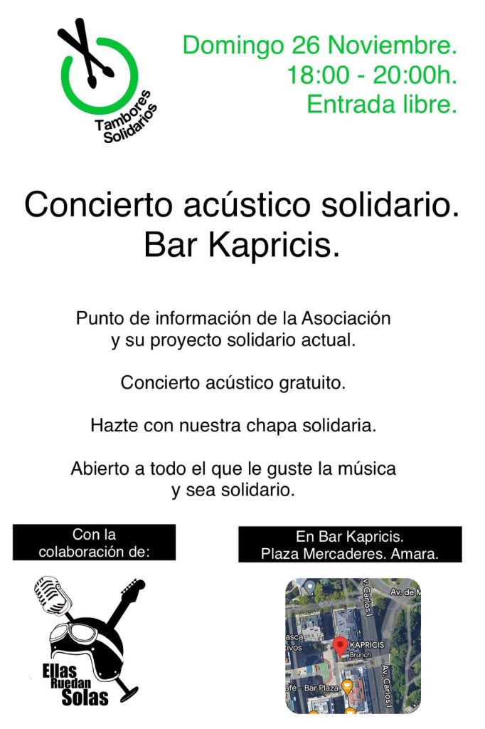 Hola, el próximo domingo 26 de noviembre vamos a hacer un concierto solidario a las 18:00 de la tarde en el bar Capricis de Amara. Es totalmente gratuito y la idea es dar a conocer la asociación. Nuestros amigos del Capricis nos ceden el espacio para poder hacer el concierto y nuestras amigas de “ELLAS RUEDAN SOLAS” nos amenizarán con su música, versiones acústicas de canciones conocidas que os encantarán. Os invitamos a que paséis por allí a saludarnos y a disfrutar de buena música (de 18:00 a 20:00) y que invitéis a todos vuestros amigos y familiares!